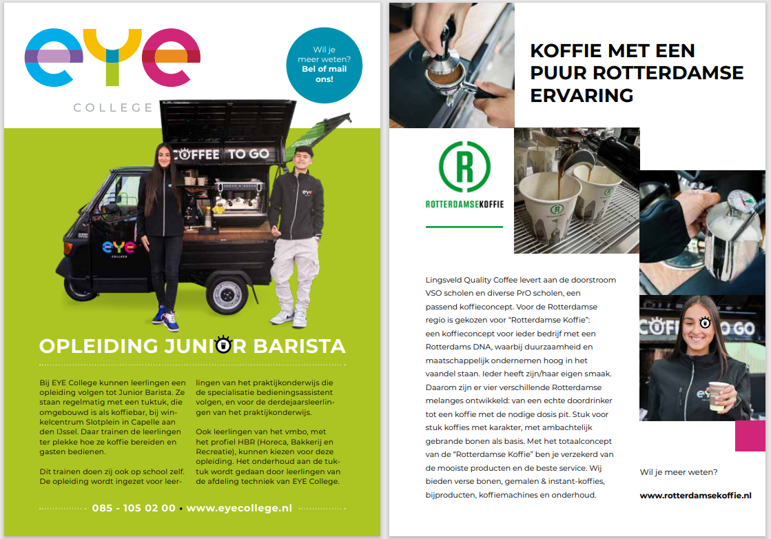 Bij EYE College kunnen leerlingen een opleiding volgen tot Junior Barista. Ze staan regelmatig met een tuktuk, die omgebouwd is als koffiebar, bij winkelcentrum Slotplein in Capelle aan den IJssel. Daar trainen de leerlingen ter plekke hoe ze koffie bereiden en gasten bedienen.